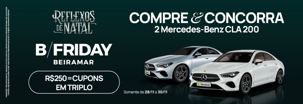 O Beiramar Shopping promove, até o dia 30 de novembro, uma Black Friday histórica, com descontos que chegam a 85% em diversas lojas. Algumas operações já anteciparam as ofertas desde o início de novembro, ampliando as oportunidades para os consumidores. Além disso, durante sexta, sábado e domingo, os clientes que comprarem no Shopping, recebem cupons em triplo para participarem da campanha Reflexos de Natal, aumentando as chances de concorrer aos dois Mercedes que serão sorteados.