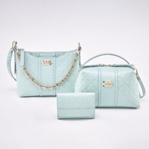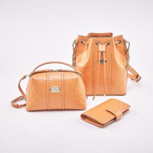 Nas bolsas de diferentes tamanhos, mochilas e tote, os tons Dusty Cedar (rosa terroso aquecido), Pale Apricot (laranja bem suave), Desert (pôr-do-sol) e Posseidon (azul intenso). Em Leather Fly, Canva Mix e Jaquard com detalhes em couro. As alças são em couro ou correntes banhadas com até 10 microns de ouro.
